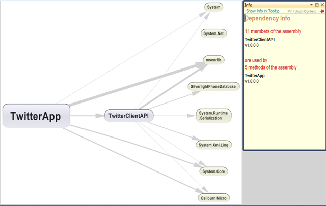 How cool it is, by just looking at this graph I can visualize how much is the coupling between the assemblies. Clicking on the arrow will give you an info window on the right side and will provide the details of the coupling.