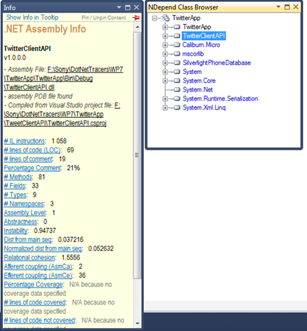 I thought of writing this blog after going through the features of NDepend. First I thought I will analyze any of my existing code but I didn’t feel comfortable in analyzing old codes. One reason is, I might have forgotten how the function calls and the dependency structure. So I decided to write a new application and run NDepend on it, so that I can benchmark it better. I wrote a Twitter Public timeline reader for WP7 to test NDepend. You all can see the details of that project in my previous post.
