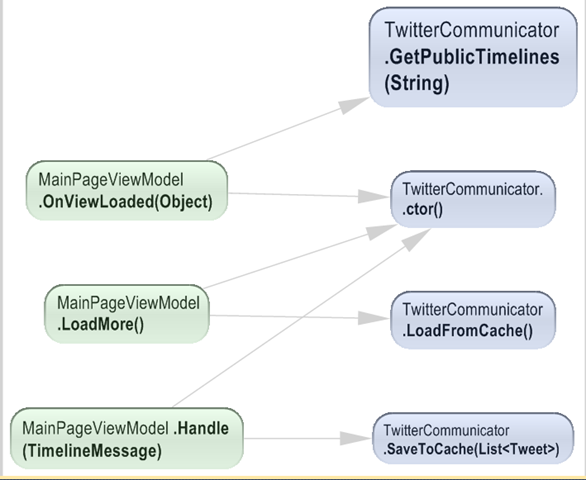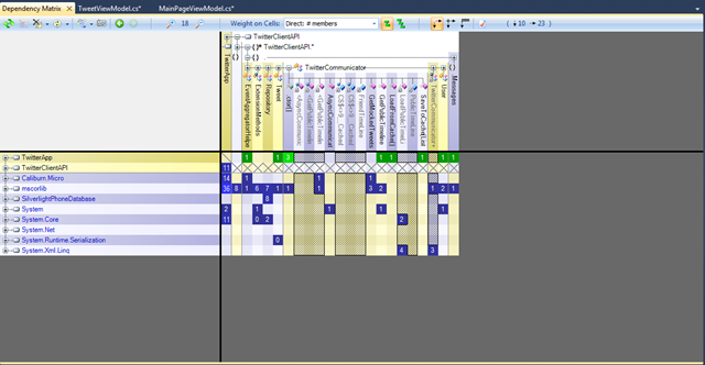 I only wanted to do is just expand the TwitterClientAPI on the top and again expand the TwitterCommunicatorAPI as shown below. The matrix shows that TwitterApp is calling GetPublicTimeLine function ones, yes its true. Same like it will display for other functions as well.