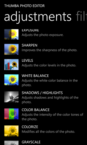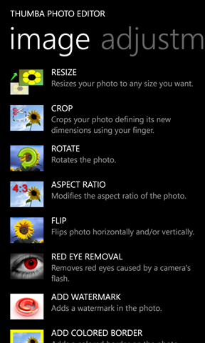 In Thumba editor, editing functionalities are categorized into Image, Adjustments, Filters and Effects. All the functionality in each category have an inline description as well.