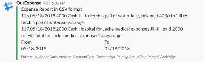 The main focus of this app is to capture the expense, for now it uses slack command to forward text to the service. Initially created a strict pattern to record expense for e.g.