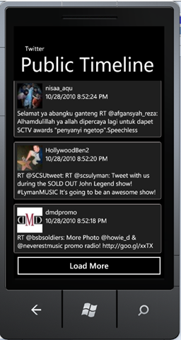 This is my first app for Windows Phone 7. This application doesn’t have much functionality, it just make a call to Public Timeline rest api to get the tweets. I choose PublicTimeline as it doesn’t requires any Twitter authentication. John Papa have a blog about communicating with Twitter, I used his blog to gather the details to communicate with Twitter. As usual I used my favorite MVVM frame work Caliburn Micro here as well. To kick start with WP7 development using caliburn micro I suggest to download the template from shazaml.com. The template has the CM’s WP7 bootstrapping technique mentioned by Rob Eisenberg in his blog.