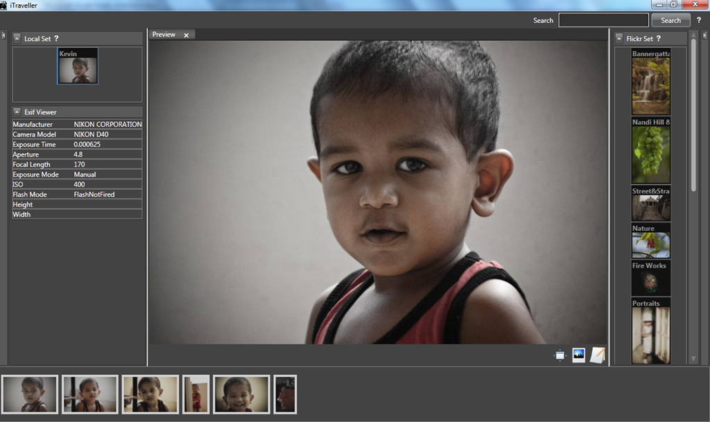 First step in using iTraveller is creating a Local set. You can create a local set by dragging and dropping your photos from Windows explorer to the Local Set box at the left top pane. When you drag and drop photos to Local Set pane, it will ask whether you need to create a new set or add to an existing category. You can see the photos inside a category by clicking on category and all the photos inside the category will show in the bottom pane of the application.